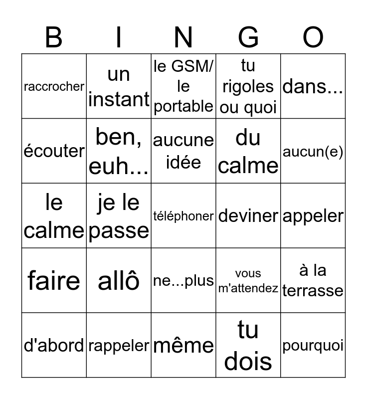 This bingo card has 38 words: FREE!, le chien, l'idée, ben, euh..., à la terrasse, allô, aucune idée, c'est le, dans..., du calme, je le passe, tu rigoles ou quoi, téléphoner, appeler, écouter, faire, sonner, le GSM/ le portable, décrocher, deviner, raccrocher, rappeler, aucun(e), d'abord, trouver, même, pourquoi, à la maison, c'est qui à l'appareil, il répond, il sait, ne...plus, tu dois, un instant, un peu (de), vous m'attendez, le calme and le numéro téléphone.