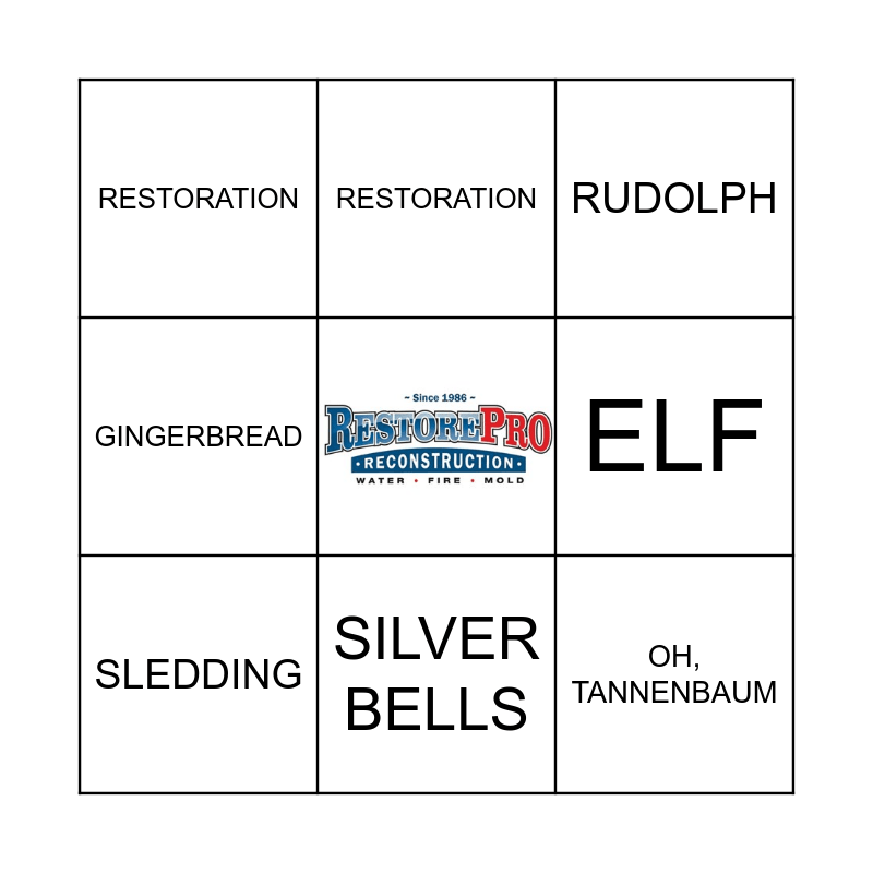 This bingo card has a free space and 20 words: SANTA, WATER DAMAGE, RUDOLPH, WINTER WONDERLAND, FESTIVAL OF LIGHTS, OH, TANNENBAUM, ICE SKATING, RESTORATION, FIRE DAMAGE, RESTORATION, RECONSTRUCTION, PRANCER, ELF, SLEIGH RIDE, SLEDDING, THE GRINCH, SILVER BELLS, GINGERBREAD, DREIDEL and EGG NOG.