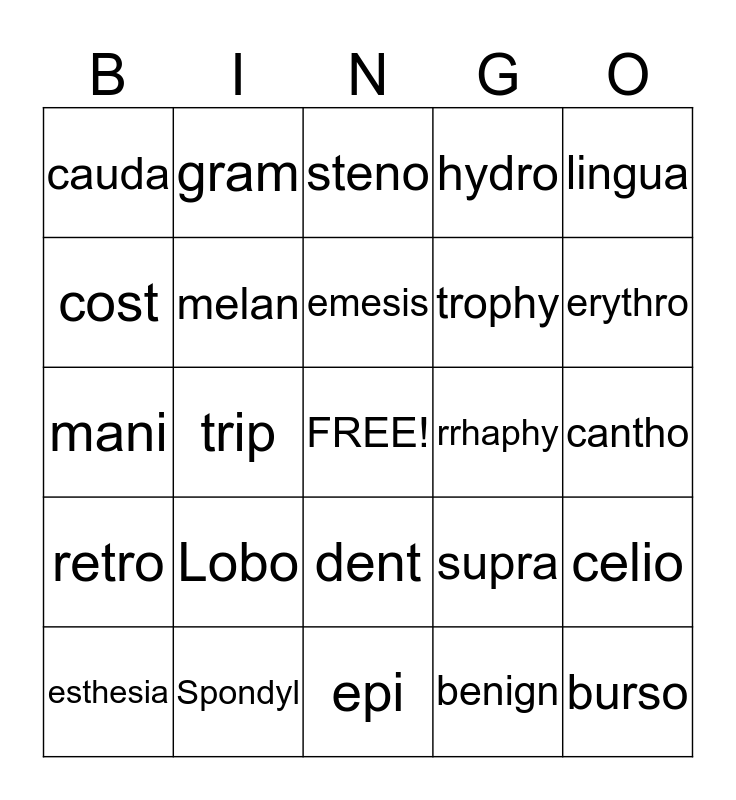 This bingo card has a free space and 24 words: Lobo, Spondyl, emesis, esthesia, lingua, cauda, cost, gram, rrhaphy, dent, trophy, mani, supra, celio, melan, benign, cantho, steno, erythro, trip, burso, retro, hydro and epi.