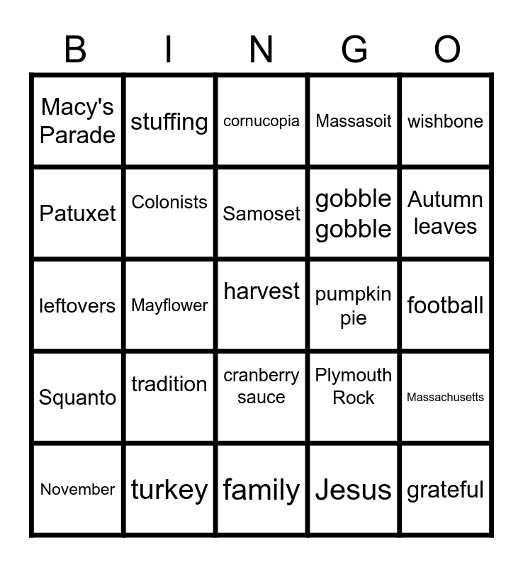 This bingo card has 30 words: turkey, pilgrims, Mayflower, Thursday, Macy's Parade, cornucopia, Colonists, cranberry sauce, pumpkin pie, family, football, harvest, Jesus, grateful, Autumn leaves, New World, Plymouth Rock, Squanto, tradition, wishbone, leftovers, Wampanoag Indians, stuffing, gobble gobble, Patuxet, Massasoit, Massachusetts, November, Samoset and 1621.