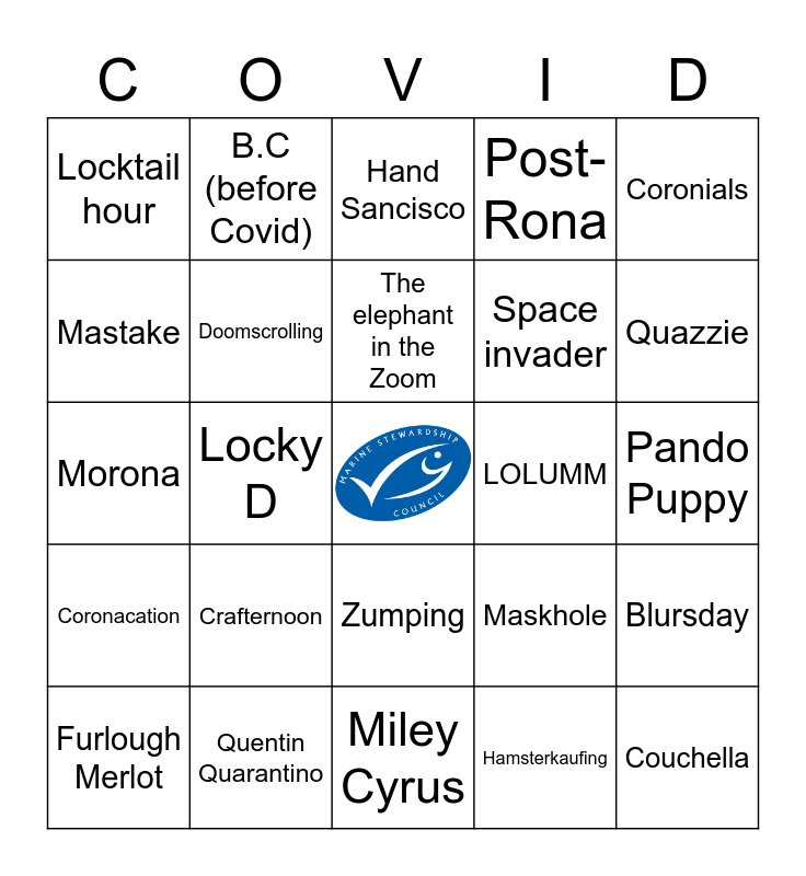 This bingo card has a free space and 24 words: Crafternoon, Quentin Quarantino, The elephant in the Zoom, Furlough Merlot, Coronials, Locktail hour, Mastake, B.C (before Covid), LOLUMM, Zumping, Space invader, Morona, Maskhole, Blursday, Doomscrolling, Hamsterkaufing, Pando Puppy, Hand Sancisco, Quazzie, Locky D, Couchella, Coronacation, Post-Rona and Miley Cyrus.