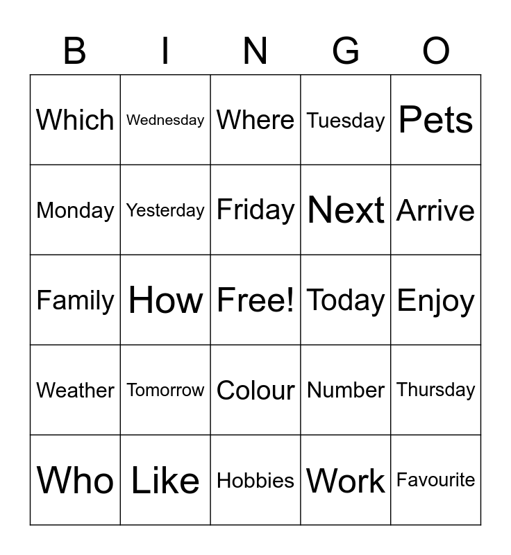This bingo card has a free space and 29 words: Who, When, How, Why, Which, Where, Yesterday, Tomorrow, Today, Like, Enjoy, Favourite, Hobbies, Work, Arrive, Clothes, Colour, Weather, Pets, Family, Number, Sign, Next, Monday, Tuesday, Wednesday, Thursday, Friday and Weekend.