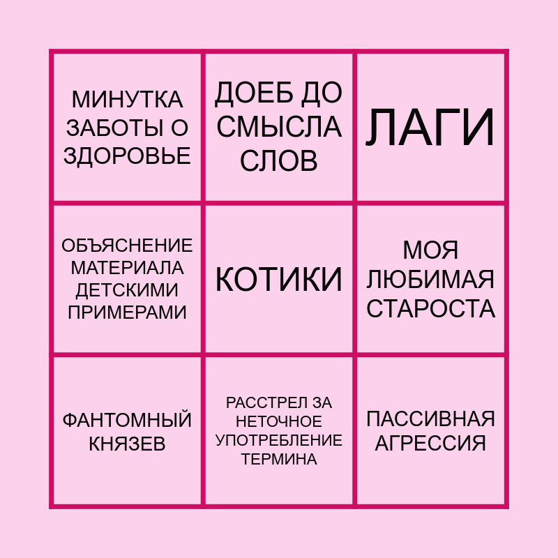 This bingo card has a free space and 8 words: МОЯ ЛЮБИМАЯ СТАРОСТА, ЛАГИ, ДОЕБ ДО СМЫСЛА СЛОВ, ФАНТОМНЫЙ КНЯЗЕВ, МИНУТКА ЗАБОТЫ О ЗДОРОВЬЕ, ПАССИВНАЯ АГРЕССИЯ, ОБЪЯСНЕНИЕ МАТЕРИАЛА ДЕТСКИМИ ПРИМЕРАМИ and РАССТРЕЛ ЗА НЕТОЧНОЕ УПОТРЕБЛЕНИЕ ТЕРМИНА.