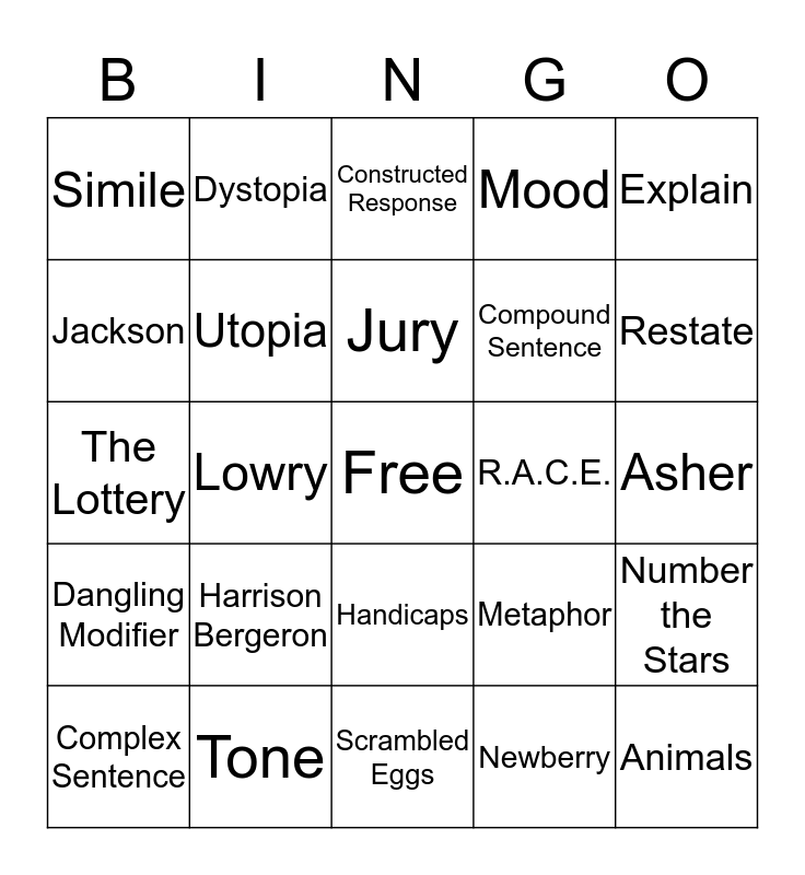 This bingo card has a free space and 24 words: Harrison Bergeron, Tone, Jury, Complex Sentence, Explain, Simile, Jackson, Dystopia, R.A.C.E., Handicaps, Compound Sentence, The Lottery, Metaphor, Number the Stars, Utopia, Newberry, Asher, Constructed Response, Restate, Lowry, Animals, Dangling Modifier, Mood and Scrambled Eggs.