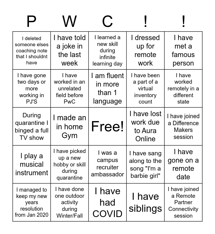 This bingo card has a free space and 39 words: I uploaded to Digital Labs, I used a Life event in Benefits Express, I have pet/s, I have worked in an unrelated field before PwC, I managed to keep my new years resolution from Jan 2020, I was a campus recruiter ambassador, I am fluent in more than 1 language, I ran at least 1 marathon, I have met a famous person, I play a musical instrument, I made an in home Gym, I dressed up for remote work, I have joined a Remote Partner Connectivity session, I have joined a Difference Makers session, I have lost work due to Aura Online, I have picked up a new hobby or skill during quarantine, I have (or helped a friend) baby proof a house in 2020, I deleted someone elses coaching note that I shouldnt have, I used a monitor or a mouse when I work, I have sang along to the song "I'm a barbie girl", I have gone two days or more working in PJ'S, I have had COVID, I have been a part of a virtual inventory count, I have worked remotely in a different state, My favorite client is Maxwell, I have had a virtual coffee meeting with one of my colleagues, I have worked in bed for more than one day, I made Pizza at home, I have driven a car without a license, I have told a joke in the last week, I am doing a virtual Thanksgiving this year, I tried to make bread during quarantine, I learned a new skill during infinite learning day, I have done one outdoor activity during Winter/Fall, I have siblings, I have driven a car with over 100,000 miles, I have gone on a remote date, During quarantine I binged a full TV show and I have traveled out of the country.