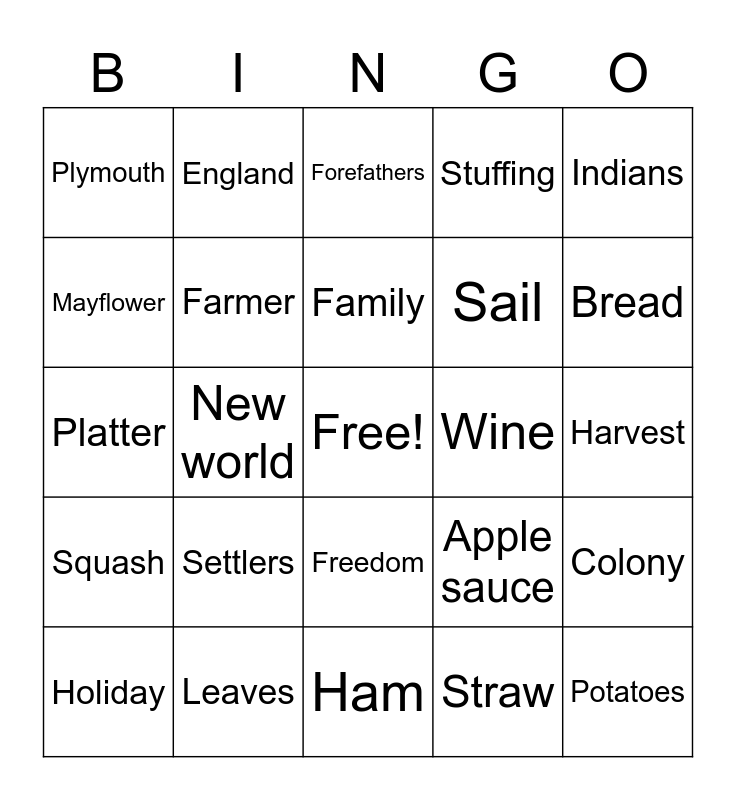 This bingo card has a free space and 65 words: Carve, America, Canoe, Colony, Cook, Corn, England, Fall, Family, Feast, Freedom, Gravy, Harvest, Indians, Maize, Mayflower, New world, Plymouth, Pumpkin, Sail, Settlers, Squash, Stuffing, Thanksgiving, Treaty, Voyage, Yams, Cornucopia, Potatoes, November, Holiday, Football, Apple pie, Tablecloth, Apple sauce, Leaves, Gobble, Platter, Straw, Scarecrow, Farmer, Cranberry sauce, Wine, Wishbone, Pecan pie, Bountiful, Bread, Roast, Centerpiece, Pumpkin Pie, Gratitude, Walnuts, Nutmeg, Ham, Spinach, Serve, Happy, Forefathers, Friends, Together, Travel, Thankful, Massachusetts, Drumstick and Celebrate.