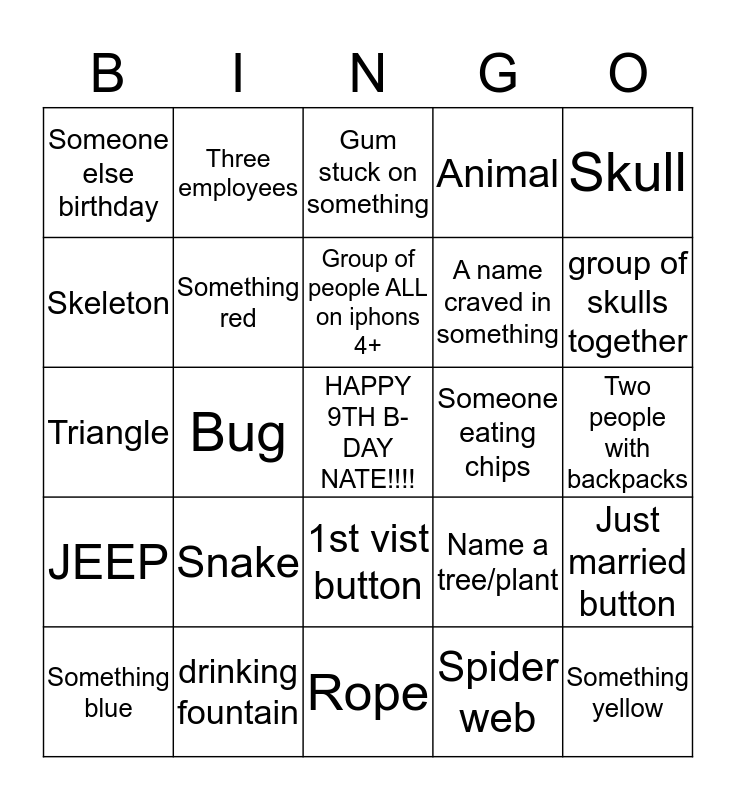 This bingo card has a free space and 24 words: Snake, drinking fountain, Group of people ALL on iphons 4+, Something blue, Skull, Someone else birthday, Skeleton, Three employees, Someone eating chips, 1st vist button, A name craved in something, Triangle, Name a tree/plant, Just married button, Something red, Spider web, Two people with backpacks, Gum stuck on something, group of skulls together, Bug, Something yellow, JEEP, Animal and Rope.
