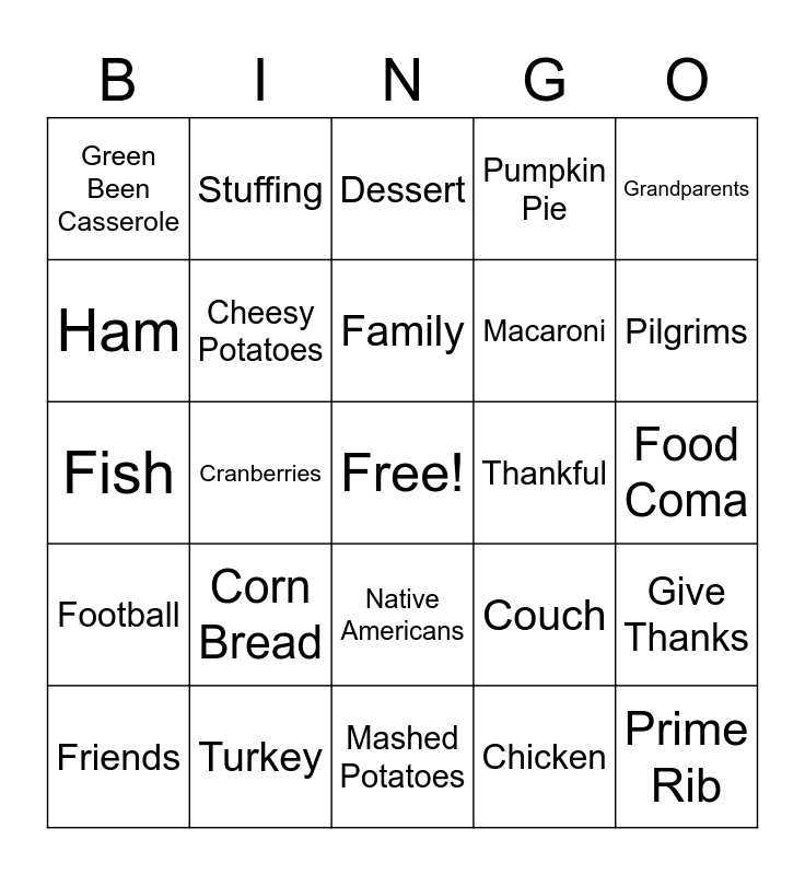 This bingo card has a free space and 24 words: Corn Bread, Turkey, Family, Friends, Grandparents, Green Been Casserole, Ham, Stuffing, Thankful, Native Americans, Macaroni, Fish, Couch, Give Thanks, Cheesy Potatoes, Chicken, Food Coma, Dessert, Pilgrims, Cranberries, Prime Rib, Football, Pumpkin Pie and Mashed Potatoes.
