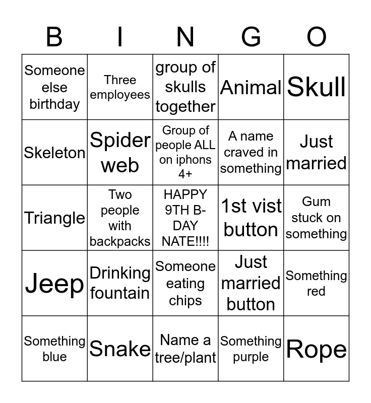 This bingo card has a free space and 24 words: Drinking fountain, Snake, Group of people ALL on iphons 4+, Something blue, Skull, Someone else birthday, Skeleton, Three employees, 1st vist button, Someone eating chips, A name craved in something, Triangle, Just married button, Something red, Spider web, Something purple, Gum stuck on something, group of skulls together, Just married, Two people with backpacks, Rope, Jeep, Animal and Name a tree/plant.