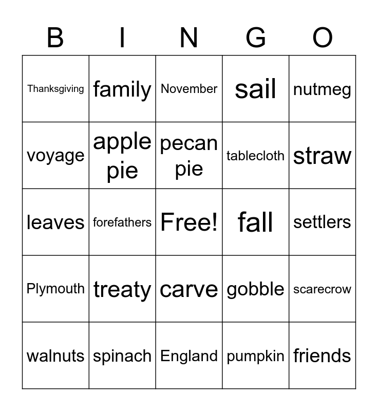 This bingo card has a free space and 24 words: treaty, spinach, pecan pie, walnuts, nutmeg, Thanksgiving, voyage, family, fall, carve, tablecloth, leaves, gobble, scarecrow, apple pie, pumpkin, settlers, November, straw, forefathers, friends, Plymouth, sail and England.