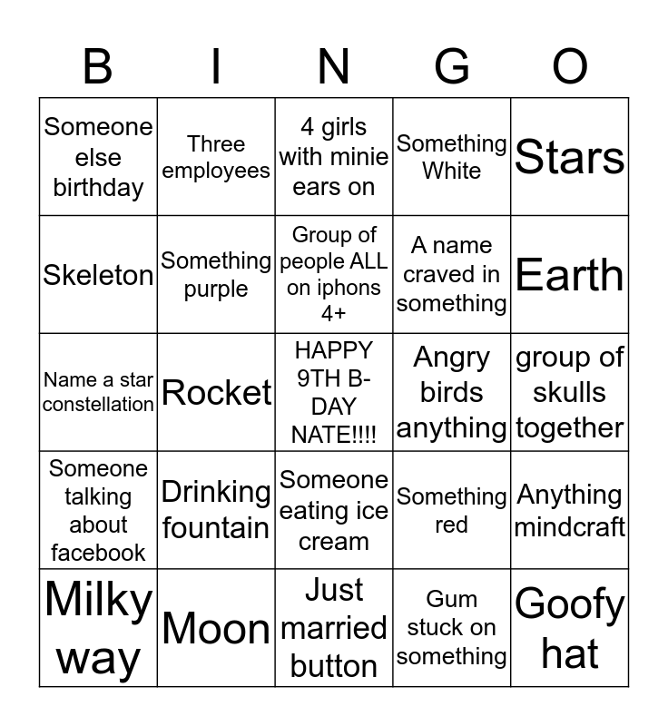 This bingo card has a free space and 24 words: Drinking fountain, Moon, Group of people ALL on iphons 4+, Milky way, Stars, Someone else birthday, Skeleton, Three employees, Angry birds anything, Someone eating ice cream, A name craved in something, Name a star constellation, Something red, Anything mindcraft, Something purple, Gum stuck on something, group of skulls together, 4 girls with minie ears on, Earth, Rocket, Goofy hat, Someone talking about facebook, Something White and Just married button.