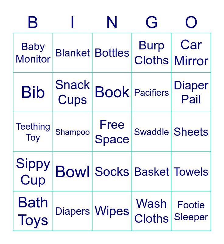 This bingo card has a free space and 28 words: Towels, Onesies, Pacifiers, Wash Cloths, Bib, Bottles, Blanket, Sippy Cup, Swaddle, Bath Toys, Teething Toy, Burp Cloths, Diapers, Wipes, Diaper Pail, Diaper Bag, Bowl, Snack Cups, Book, Socks, Baby Monitor, Play Gym, Footie Sleeper, Shampoo, Sheets, Basket, Car Mirror and Car Seat Cover.