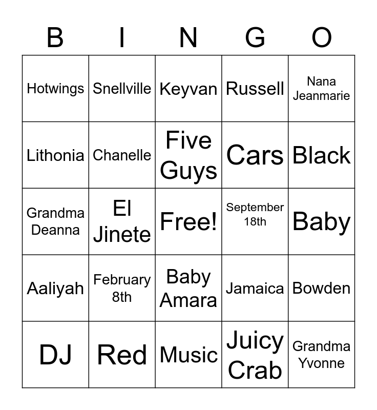 This bingo card has a free space and 24 words: February 8th, Red, Five Guys, DJ, Nana Jeanmarie, Hotwings, Lithonia, Snellville, September 18th, Baby Amara, Cars, Grandma Deanna, Jamaica, Bowden, Chanelle, Juicy Crab, Baby, Keyvan, Black, El Jinete, Grandma Yvonne, Aaliyah, Russell and Music.