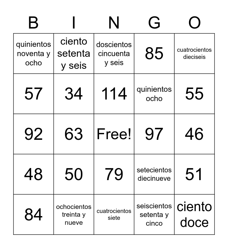 This bingo card has a free space and 24 words: 50, ochocientos treinta y nueve, 114, 84, cuatrocientos dieciseis, quinientos noventa y ocho, 57, ciento setenta y seis, 97, 79, quinientos ocho, 92, setecientos diecinueve, 51, 34, seiscientos setenta y cinco, 46, doscientos cincuenta y seis, 55, 63, ciento doce, 48, 85 and cuatrocientos siete.