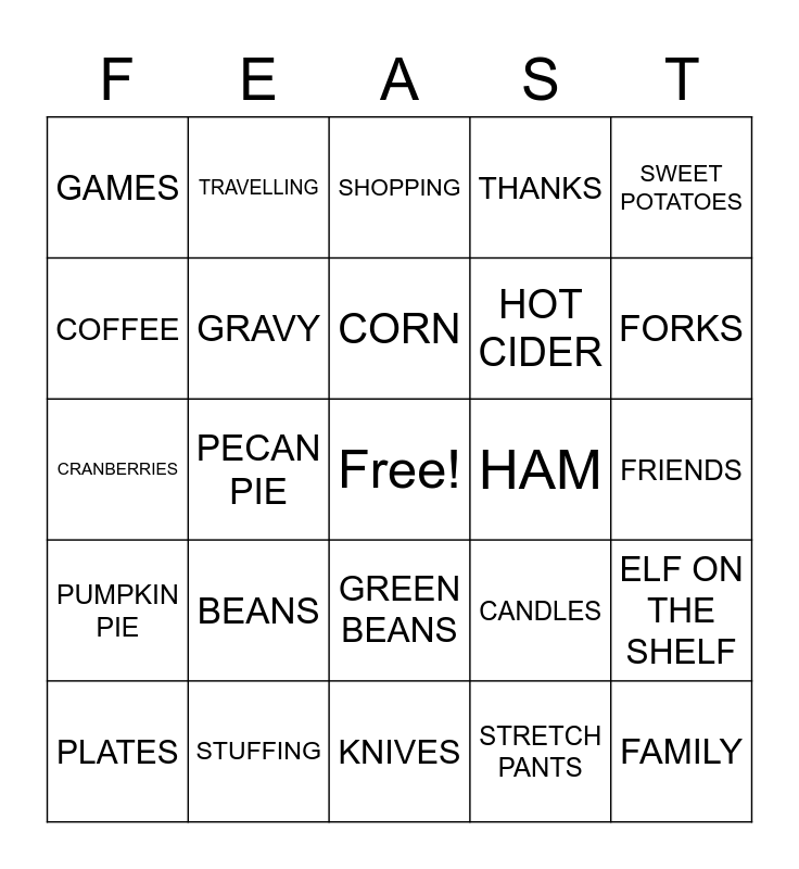 This bingo card has a free space and 40 words: TURKEY, CRANBERRIES, MASHED POTATOES, GRAVY, STUFFING, GREEN BEANS, CORN, ROLLS, SWEET POTATOES, PUMPKIN PIE, PECAN PIE, THANKS, FAMILY, FRIENDS, HAM, BEANS, FOOTBALL, GAMES, PARADE, SHOPPING, ELF ON THE SHELF, STRETCH PANTS, HOT CIDER, COFFEE, TEA, WINE, FISH, SNACKS, APPETIZERS, COOKIES, TABLECLOTH, PLATES, CUPS, CANDLES, FORKS, KNIVES, SPOONS, NAPKINS, TRAVELLING and NAPS.