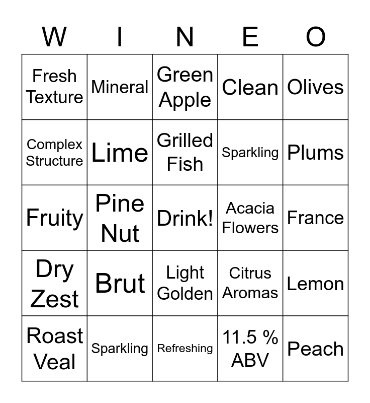 This bingo card has a free space and 24 words: Brut, Sparkling, Grilled Fish, Roast Veal, Olives, Fresh Texture, Complex Structure, Mineral, Acacia Flowers, Light Golden, Sparkling, Fruity, Citrus Aromas, Lemon, Lime, 11.5 % ABV, France, Green Apple, Plums, Pine Nut, Peach, Dry Zest, Clean and Refreshing.