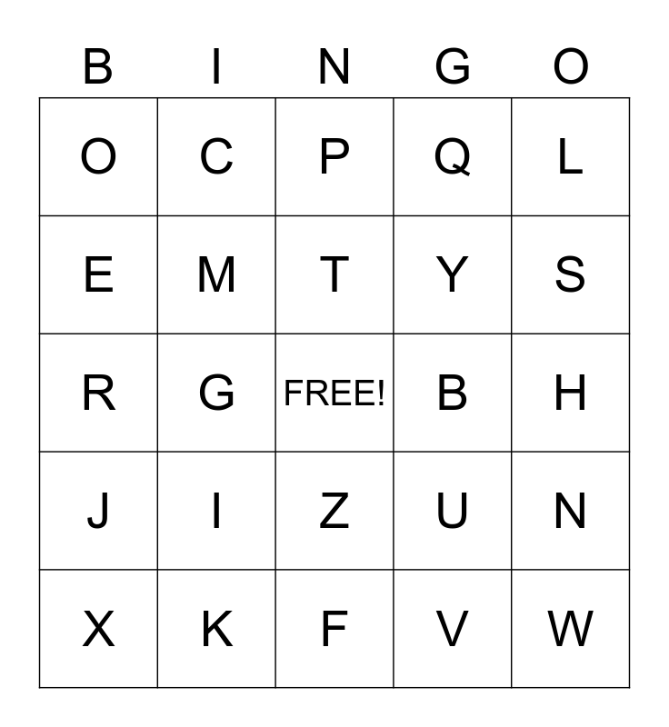 This bingo card has a free space and 24 words: I, K, T, X, L, O, E, C, B, Z, Y, R, U, N, M, V, H, P, S, G, W, J, Q and F.