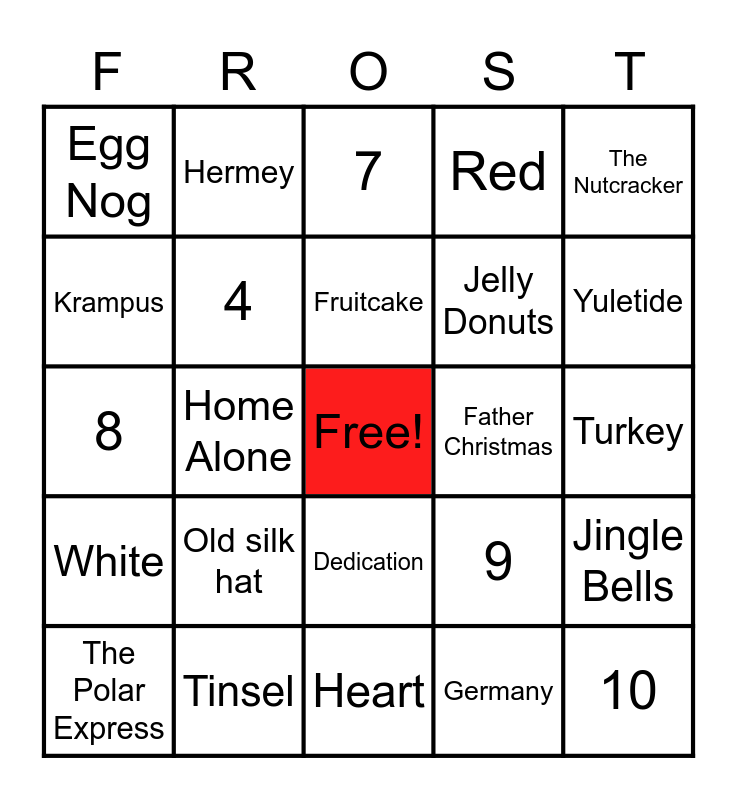 This bingo card has a free space and 24 words: Old silk hat, Tinsel, Fruitcake, The Polar Express, The Nutcracker, Egg Nog, Krampus, Hermey, Father Christmas, Dedication, Jelly Donuts, 8, 9, Jingle Bells, 4, Germany, Turkey, 7, Yuletide, Home Alone, 10, White, Red and Heart.