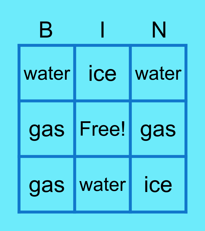 This bingo card has a free space and 11 words: gas, water, ice, gas, ice, water, gas, Free!, gas, water and ice.