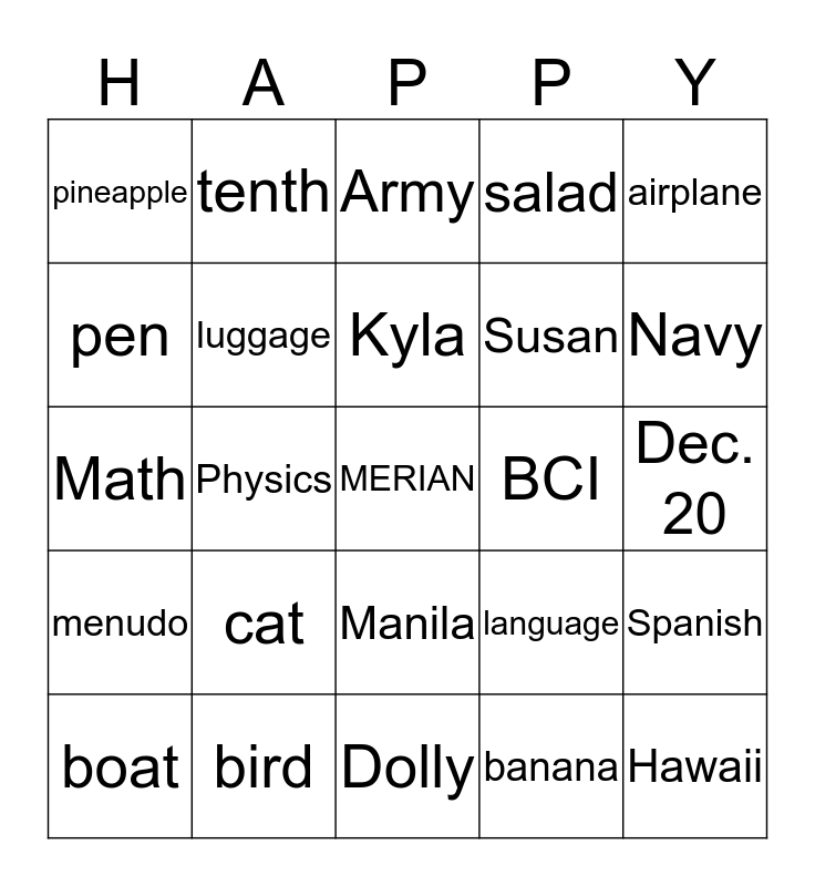 This bingo card has a free space and 24 words: cat, bird, Kyla, boat, airplane, pineapple, pen, tenth, BCI, Manila, Susan, Math, language, Spanish, luggage, banana, Dec. 20, Army, Navy, Physics, Hawaii, menudo, salad and Dolly.
