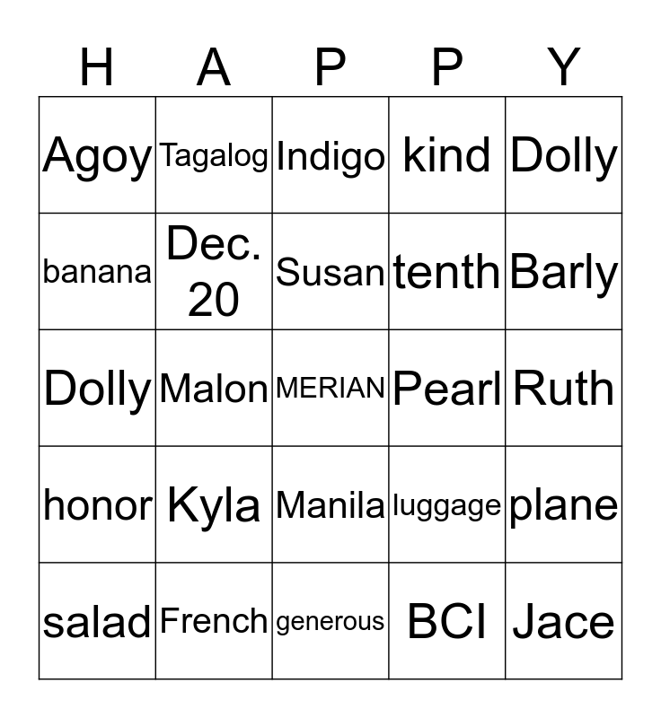 This bingo card has a free space and 24 words: Kyla, French, Susan, salad, Dolly, Agoy, banana, Tagalog, Pearl, Manila, tenth, Dolly, luggage, plane, Dec. 20, BCI, Ruth, Indigo, Barly, Malon, Jace, honor, kind and generous.