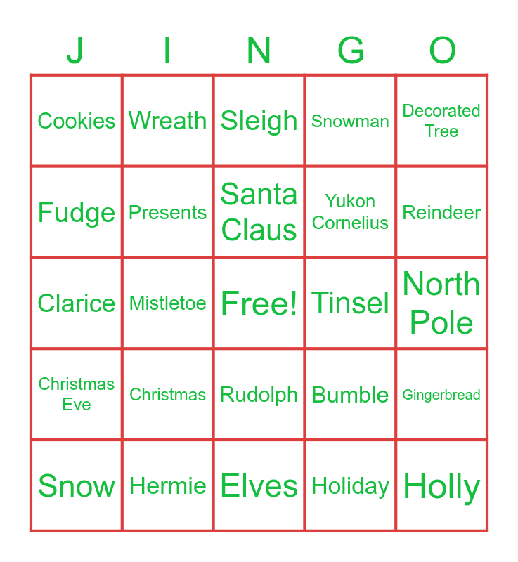 This bingo card has a free space and 25 words: Christmas, Elves, Santa Claus, Snow, Decorated Tree, Cookies, Fudge, Wreath, Tinsel, Rudolph, Yukon Cornelius, Clarice, Bumble, Gingerbread, Presents, Naughty List, North Pole, Sleigh, Reindeer, Mistletoe, Holly, Hermie, Christmas Eve, Snowman and Holiday.