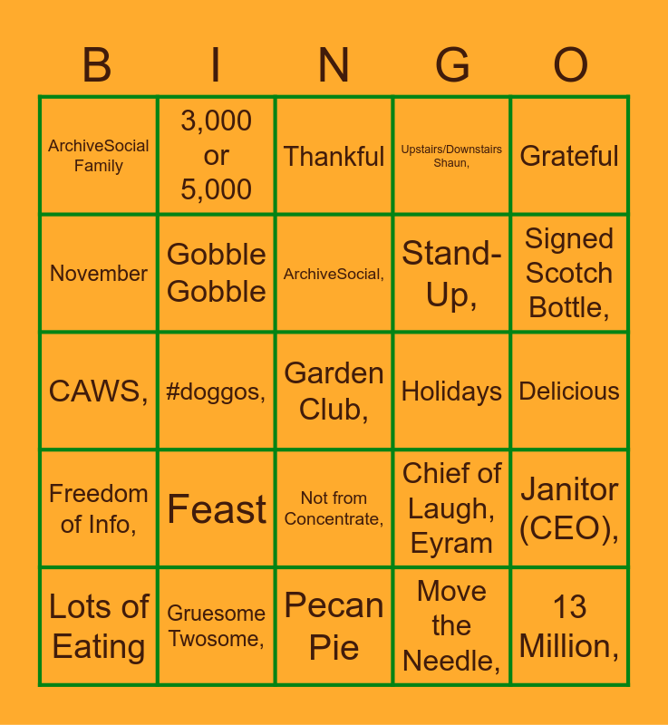 This bingo card has 131 words: Free!, 3,000 or 5,000, SalesOps, Economy $199,, Hungry & Humble,, Webby Snappy,, Freedom of Info,, Archiving,, Ops,, Pragmatic Perfection,, Merch Bucks,, Premium $599,, Marketing,, Product Team,, Social Media,, Trello,, Move the Needle,, Standard $399,, Punk Pickle,, LaughStaff,, Work Laugh,, Garden Club,, Stand-Up,, The Table,, Happy Hour,, Slack,, #doggos,, #random,, #general,, Virtual,, Upstairs/Downstairs Shaun,, Janitor (CEO),, Signed Scotch Bottle,, 13 Million,, 40 Pound Pumpkin,, Bull McCabes,, Chili Piper,, FU,, Sandbox,, Invoicing,, ArchiveSocial,, Pioneers,, #beerand-orboardgames,, Customer Experience,, On Call,, Flamingo Friday,, Optimistic Thursday,, Winsday,, Side-By-Side Comparison,, Twosday,, Hey Thanks Monday,, Google Chrome Updates,, Trust Building,, IZack (Friday),, Mati,, Lyle in Finance,, TigerTeam,, Peakon,, Show & Tell,, Gruesome Twosome,, Swoops,, Vonage,, States,, Inclusion,, Bronze Bug Award,, Golden Quill,, Captain Crunch Award,, #10 million thread count,, CAWS,, Green Like Money,, Not from Concentrate,, Late Bluemers,, Well Red Thread,, Expensify,, Ops Request Form,, Customers,, Brain Food,, Emojis,, Celebration, Cooking, Cranberry sauce, Fall, ArchiveSocial Family, Feast, Friends, Gravy, Holidays, Thanksgiving Day, Pecan Pie, Apple Pie, Pumpkin Pie, Blueberry Pie, All the Pies!, Mashed Potaters, Pumpkins!, Turkey, Grateful, Black Friday, November, Wishbone, Leftovers, Thankful, Pumpkin patch, Leaves changing colors, Corn Pudding, Celebrate, Delicious, Dessert, Lots of Eating, Gratitude, Gobble Gobble, Ham, Parents, Oven, Recipe, Stuffing, Tasty, Swapping Recipes, Holiday Drinks Catalogue, Corn, Lots of Butta!, Appreciation, Bojangles, Colder weather, Winter is coming, 6 more days until Dec, Chief of Laugh, Eyram, Warm & Cozy, 4 Day Weekend, Relaxing and Cherish.
