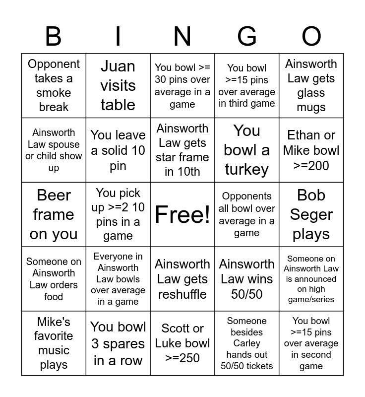 This bingo card has a free space and 40 words: 2 songs by same artist play, Beer frame on you, You pick up a split, You leave a solid 10 pin, You bowl 3 spares in a row, Ainsworth Law gets reshuffle, Ainsworth Law gets star frame in 10th, Ainsworth Law lane jams, Ainsworth Law gets glass mugs, Someone on Ainsworth Law orders food, You pick up >=2 10 pins in a game, You bowl >=15 pins over average in third game, You bowl >=15 pins over average in second game, Bob Seger plays, Opponents all bowl over average in a game, Everyone in Ainsworth Law bowls over average in a game, You bowl >=30 pins under in a game, Opponent takes a smoke break, Luke, Caleb, or Scott get clean game, You bowl >= 30 pins over average in a game, Someone on Ainsworth Law is announced on high game/series, Someone besides Carley hands out 50/50 tickets, You bowl a turkey, Ainsworth Law spouse or child show up, Ainsworth Law gets 4 points, Mayor visits table, REO Speedwagon plays, Alex wins poker, Luke wins poker, Ainsworth Law beans and cheese, Red Hot Chili Peppers play, Mike's favorite music plays, Adjacent table wins 50/50, Ainsworth Law wins 50/50, Ethan or Mike bowl >=200, Scott or Luke bowl >=250, Someone on Ainsworth Law gets a gutter, Caleb, Scott, or Luke miss a 10 pin, Juan visits table and Someone on Ainsworth Law gets 7-10 split.