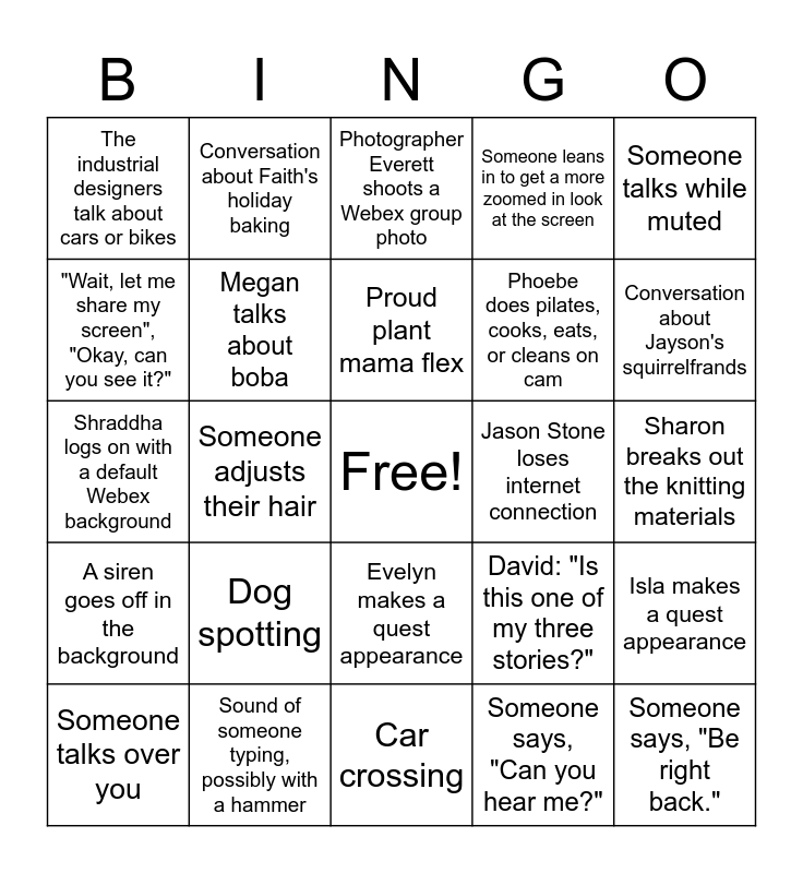 This bingo card has a free space and 25 words: Dog spotting, Car crossing, Proud plant mama flex, Someone talks over you, Someone talks while muted, The industrial designers talk about cars or bikes, "Wait, let me share my screen", "Okay, can you see it?", Conversation about Faith's holiday baking, Jason Stone loses internet connection, Evelyn makes a quest appearance, Phoebe does pilates, cooks, eats, or cleans on cam, Shraddha logs on with a default Webex background, David: "Is this one of my three stories?", Isla makes a quest appearance, Megan talks about boba, Natali and Jose are on the same screen, Sharon breaks out the knitting materials, Photographer Everett shoots a Webex group photo, Conversation about Jayson's squirrelfrands, Someone adjusts their hair, Someone says, "Be right back.", Sound of someone typing, possibly with a hammer, A siren goes off in the background, Someone leans in to get a more zoomed in look at the screen and Someone says, "Can you hear me?".