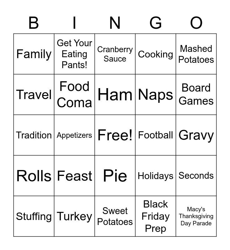 This bingo card has a free space and 24 words: Feast, Turkey, Ham, Stuffing, Mashed Potatoes, Family, Travel, Get Your Eating Pants!, Football, Pie, Naps, Tradition, Holidays, Seconds, Food Coma, Black Friday Prep, Gravy, Cranberry Sauce, Board Games, Appetizers, Macy's Thanksgiving Day Parade, Rolls, Cooking and Sweet Potatoes.
