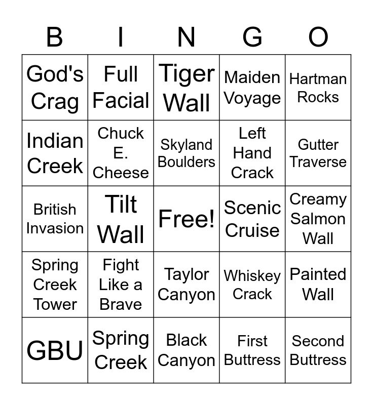 This bingo card has a free space and 24 words: Fight Like a Brave, Spring Creek, Skyland Boulders, GBU, Hartman Rocks, God's Crag, Indian Creek, Full Facial, Scenic Cruise, Taylor Canyon, Left Hand Crack, British Invasion, Whiskey Crack, Painted Wall, Chuck E. Cheese, First Buttress, Creamy Salmon Wall, Tiger Wall, Gutter Traverse, Tilt Wall, Second Buttress, Spring Creek Tower, Maiden Voyage and Black Canyon.