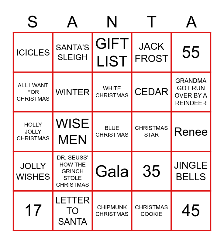 This bingo card has a free space and 299 words: Free!, ADVEN blah DAR, ALL I WANT FOR CHRISTMAS, ANGEL, BABES IN TOYLAND, BABY, BAD SANTA, BEETHOVEN’S CHRISTMAS ADVENTURE, BELLS, BIRTH, BIRTH OF CHRIST, BLESSING, BOWS, BUFFET DINNER, BUSY ELVES, CAMEL, CANDLES, CANDY CANE, CAROL, CAROL OF THE BELLS, CAROLER, CEDAR, CELEBRATION, CHARLIE BROWN CHRISTMAS, CHEER, CHESTNUTS, CHIMNEY, CHIPMUNK CHRISTMAS, CHISTMAS SALES, Christmas, CHRISTMAS CARD, CHRISTMAS CAROL, CHRISTMAS COOKIE, CHRISTMAS DAY, CHRISTMAS DINNER, CHRISTMAS EVE, CHRISTMAS FOR COWBOYS, CHRISTMAS FUTURE, CHRISTMAS GIFT, CHRISTMAS LIGHTS, CHRISTMAS MIRACLE, CHRISTMAS MONEY, CHRISTMAS MORNING, CHRISTMAS PAGEANT, CHRISTMAS PLAY, CHRISTMAS PRESENT, CHRISTMAS STAR, CHRISTMAS STORY, CHRISTMAS TREE, CHRISTMAS WISH, CRANBERRY SAUCE, DECEMBER, DECEMBER 25TH, DECK THE HALLS, DECORATIONS, DO YOU HEAR WHAT I HEAR?, Dolls, DR. SEUSS’ HOW THE GRINCH STOLE CHRISTMAS, DRESSING, DRUMMER BOY, EGGNOG, ELF, Sam, Elves, ERNEST SAVES CHRISTMAS, FAMILY, FAMILY GATHERING, FAMILY REUNION, FEAST, FELIZ NAVIDAD, FESTIVAL, FIGGY PUDDING, FIR, FIRST NOEL, FRESH SNOWFALL, Frosty, FROSTY RETURNS, FROSTY THE SNOWMAN, FROSTY’S WINTER WONDERLAND, FRUITCAKE, Gala, GATHERING, GIFT BOXES, GIFT EXCHANGE, GIFT LIST, Gifts, GINGERBREAD HOUSE, GLAD TIDINGS, GOOD LUCK CHARLIE, IT’S CHRISTMAS! (2011), GOODWILL, GRANDMA GOT RUN OVER BY A REINDEER, GREATEST GIFT OF ALL, GREETINGS, GRINCH, HALLELUJAH CHORUS, HARK! THE HERALD ANGELS SING, HAVE YOURSELF A MERRY LITTLE CHRISTMAS, HOLIDAY, HOLIDAY CELEBRATION, HOLIDAY CHEER, HOLIDAY CLASSIC, HOLIDAY FAVORITE, HOLIDAY GALA, HOLIDAY GREETINGS, HOLIDAY MAGIC, HOLIDAY PARTY, HOLIDAY SPIRIT, HOLIDAY TIDINGS, HOLIDAY TRADITION, HOLLY, HOLLY JOLLY CHRISTMAS, HOME, HOME ALONE, I SAW MOMMY KISSING SANTA CLAUS, ICICLES, I'LL BE HOME FOR CHRISTMAS, IT’S A VERY MERRY MUPPET CHRISTMAS MOVIE, IT’S A WONDERFUL LIFE, IT'S BEGINNING TO LOOK LIKE CHRISTMAS, IT'S THE MOST WONDERFUL TIME OF THE YEAR, JACK FROST, JINGLE BELL ROCK, JINGLE BELLS, JOLLY WISHES, JOY, JOY TO THE WORLD, KRISS KRINGLE, LET IT SNOW, LETTER TO SANTA, LUMP OF COAL, MARY, Renee, MENORAH, MICKEY’S CHRISTMAS CAROL, Christina, MINCE PIE, MIRACLE, MIRACLE OF CHRISTMAS, MIRACLE ON 34TH STREET, MISTLETOE, MR. GRINCH, MRS. CLAUS, MUPPET FAMILY CHRISTMAS, MUST BE SANTA, NATIONAL LAMPOON’S CHRISTMAS VACATION, NATIVITY SCENE, NOEL, NUTCRACKER, O CHRISTMAS TREE, O COME, ALL YE FAITHFUL, O HOLY NIGHT, OFFICE CHRISTMAS PARTY, ORNAMENT, OVER THE RIVER AND THROUGH THE WOODS, PARADE, PEACE, PEACE DOVE, NORTH POLE, PEPPERMINT, PINE, PLUMS, POINSETTIA, Bass, PRESENTS, REINDEER, RIBBON, ROARING FIRE, ROCKING AROUND THE CHRISTMAS TREE, ROOFTOP, RUDOLPH, Lead, SANTA, SANTA BABY, SANTA CLAUS IS COMIN’ TO TOWN, SANTA'S BAG, SANTA'S ELVES, SANTA'S LIST, SANTA'S SLEIGH, SANTA'S WORKSHOP, SCROOGE, SEASON, SEASON'S GREETINGS, SECRET SANTA, SERVICE, SHEPHERD, SHOPPING, SHREK THE HALLS, SILENT NIGHT, SILVER BELLS, SLED, SLEIGH, SLEIGH BELLS, SLEIGH RIDE, SNOW, SNOW ANGEL, SNOWFALL, SNOWFLAKE, SNOWMAN, SPIRIT, ST. NICK, STAR, STARLIGHT, STOCKING, STOCKING STUFFER, STROKE OF MIDNIGHT, SUGAR PLUMS, THE ENCHANTED CHRISTMAS, THE MUPPET CHRISTMAS CAROL, THE NIGHT BEFORE CHRISTMAS, THIS IS THAT TIME OF THE YEAR, TIDING, TINSEL, TOYS, TRADITION, TREE STAND, TRIMMINGS, TRUMPETS, TURKEY, TWAS THE NIGHT BEFORE CHRISTMAS, Baritone, UP ON THE HOUSETOP, VISIONS OF SUGARPLUMS, WE WISH YOU A MERRY CHRISTMAS, WHITE CHRISTMAS, WINTER, WINTER WONDERLAND, WISE MEN, WRAPPING PAPER, WREATH, Tenor, YOUR HOLIDAY BEST, YULE LOG, 1, 2, 3, 4, 5, 6, 7, 8, 9, 10, 11, 12, 13, 14, 15, 16, 17, 18, 19, 20, 21, 22, 23, 24, 25, 26, 27, 28, 29, 30, 31, 33, 34, 35, 36, 37, 38, 39, 40, 41, 42, 32, 43, 44, 45, 46, 47, 48, 49, 50, 51, 52, 53, 54, 55, 56, 57, 58, 59, 60, 61, 62, 63, 64, 65, 66 and 67.