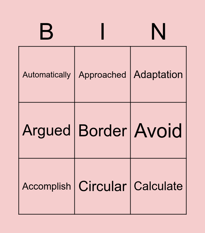 This bingo card has 9 words: Accomplish, Adaptation, Approached, Argued, Automatically, Avoid, Border, Calculate and Circular.