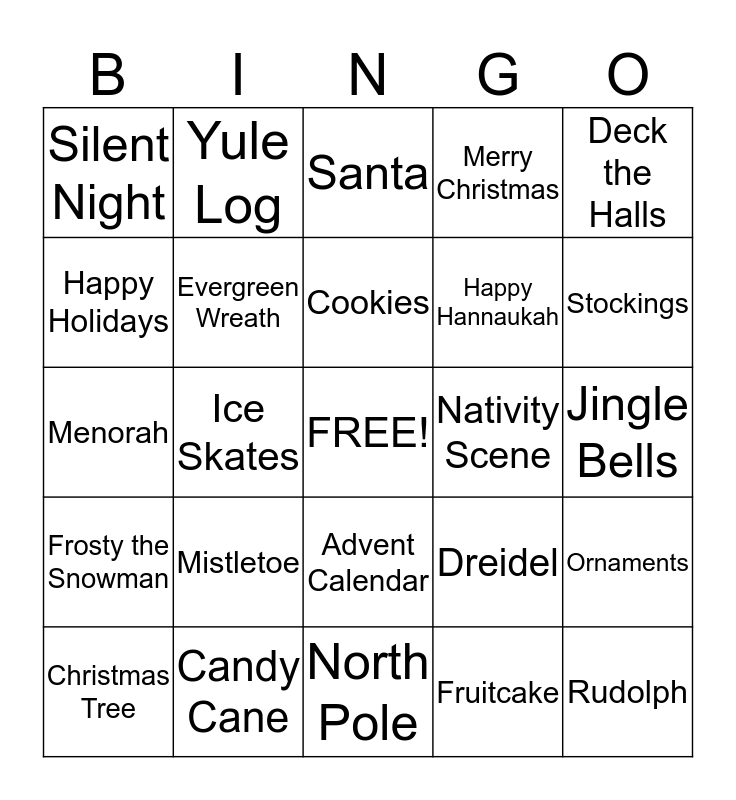 This bingo card has a free space and 24 words: Mistletoe, Candy Cane, Cookies, Christmas Tree, Deck the Halls, Silent Night, Happy Holidays, Yule Log, Nativity Scene, Advent Calendar, Happy Hannaukah, Menorah, Dreidel, Ornaments, Evergreen Wreath, Fruitcake, Jingle Bells, Santa, Stockings, Ice Skates, Rudolph, Frosty the Snowman, Merry Christmas and North Pole.