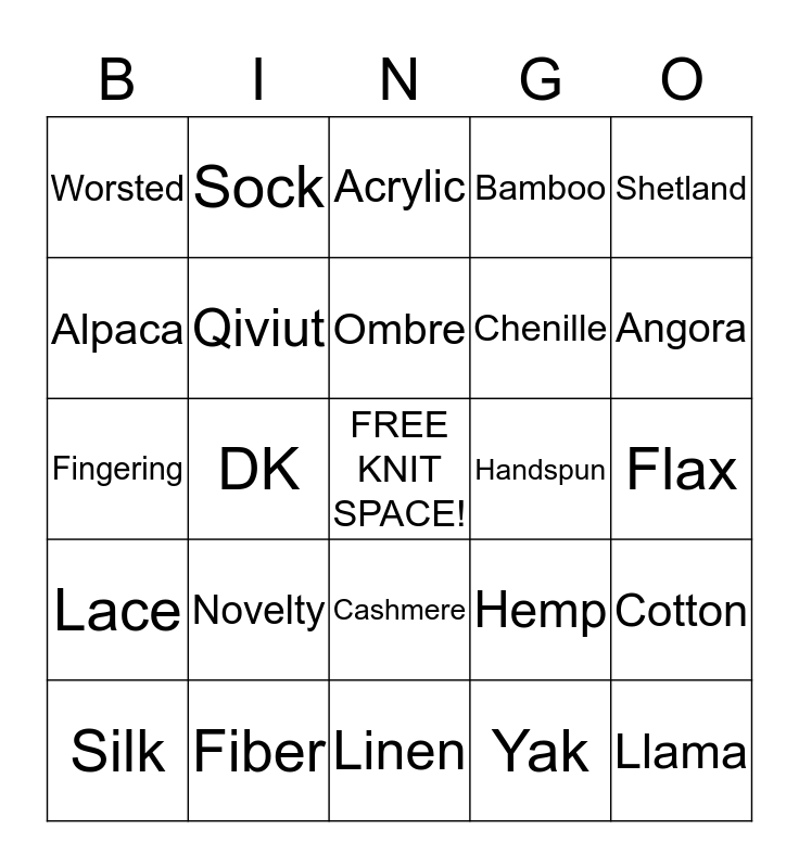 This bingo card has a free space and 41 words: Tweed, Fingering, Tencel, Qiviut, Fiber, Cashmere, Ombre, Cobweb, Shetland, Lace, DK, Bamboo, Llama, Flax, Handspun, Novelty, Aran, Worsted, Soy, Acrylic, Cotton, Mohair, Linen, Chenille, Super Bulky, Variegated, Yak, Sport, Angora, Bulky, Rayon, Sock, Silk, Metallic, Hemp, Alpaca, Merino, Woolen, Microfiber, Camel and Nylon.