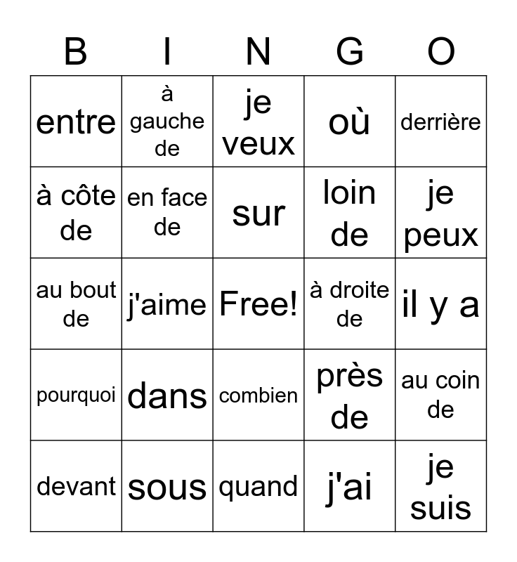 This bingo card has a free space and 24 words: dans, sous, sur, devant, derrière, entre, à côte de, à gauche de, à droite de, combien, loin de, au bout de, près de, au coin de, en face de, j'ai, il y a, je veux, je peux, j'aime, je suis, pourquoi, où and quand.
