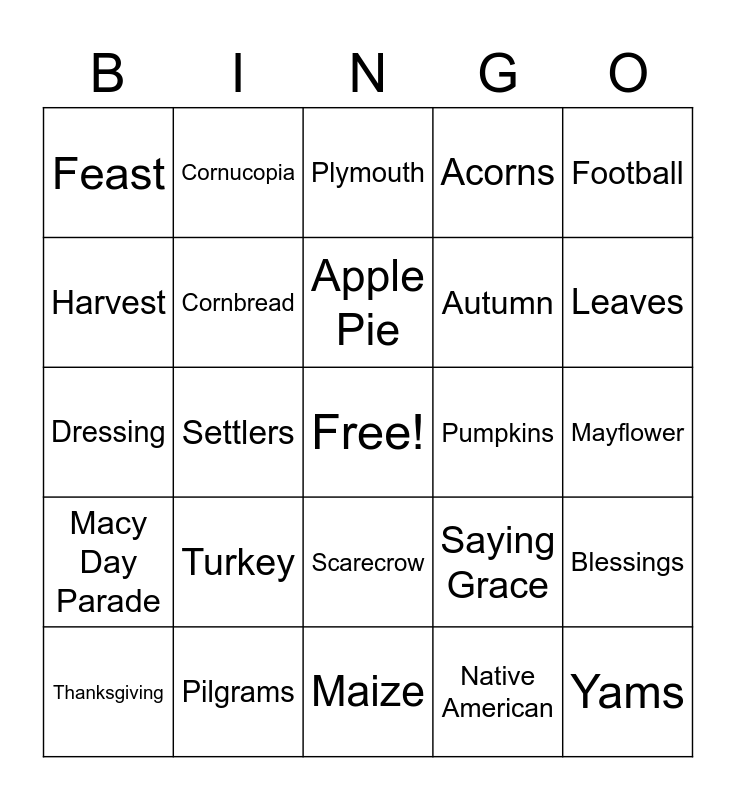 This bingo card has a free space and 24 words: Turkey, Pilgrams, Apple Pie, Thanksgiving, Football, Feast, Harvest, Cornucopia, Pumpkins, Scarecrow, Autumn, Dressing, Saying Grace, Blessings, Cornbread, Native American, Mayflower, Plymouth, Leaves, Settlers, Yams, Macy Day Parade, Acorns and Maize.