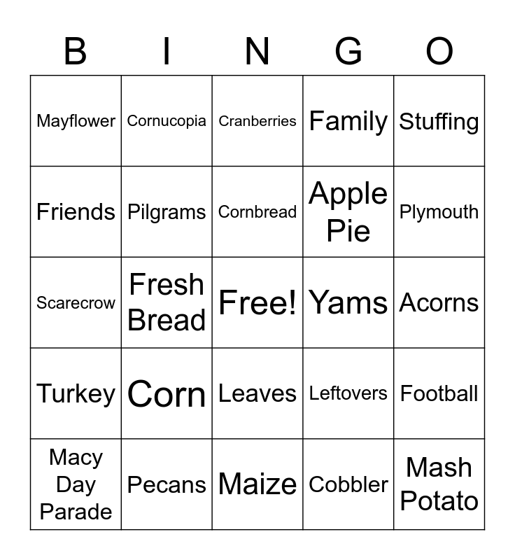 This bingo card has a free space and 29 words: Macy Day Parade, Ham, Fresh Bread, Gravy, Mayflower, Cranberries, Pilgrams, Corn, Yams, Pecans, Acorns, Mash Potato, Maize, Cobbler, Plymouth, Collard Greens, Leaves, Turkey, Stuffing, Scarecrow, Leftovers, Pumpkin Pie, Apple Pie, Friends, Family, Cornucopia, Football, Cornbread and Gobble.