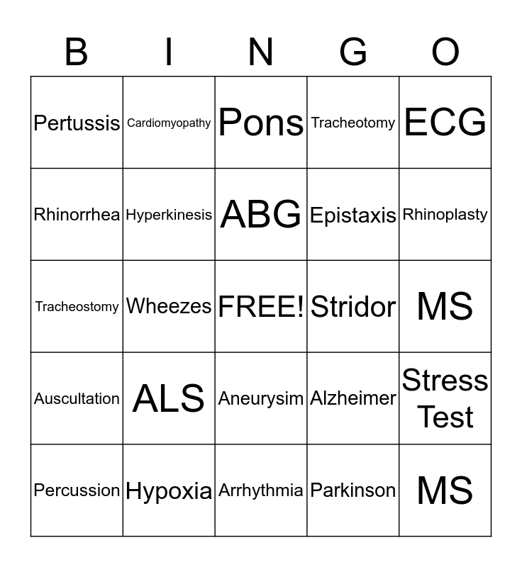 This bingo card has a free space and 24 words: ALS, Hypoxia, ABG, Percussion, ECG, Pertussis, Rhinorrhea, Cardiomyopathy, Stridor, Aneurysim, Epistaxis, Tracheostomy, Alzheimer, Stress Test, Hyperkinesis, Parkinson, MS, Pons, Rhinoplasty, Wheezes, MS, Auscultation, Tracheotomy and Arrhythmia.