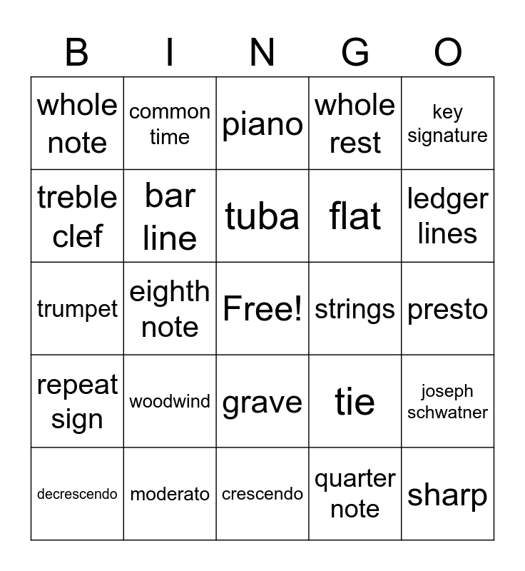 This bingo card has a free space and 24 words: woodwind, moderato, tuba, decrescendo, key signature, whole note, treble clef, common time, strings, grave, flat, trumpet, tie, joseph schwatner, bar line, quarter note, presto, piano, ledger lines, eighth note, sharp, repeat sign, whole rest and crescendo.