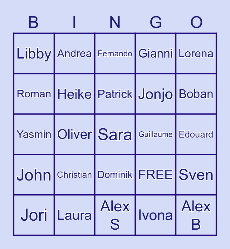 This bingo card has 25 words: Christian, Alex S, Patrick, Jori, Lorena, Libby, Roman, Andrea, Guillaume, Dominik, Jonjo, Yasmin, FREE, Sven, Heike, Alex B, Edouard, Fernando, Boban, Oliver, Sara, Laura, John, Gianni and Ivona.