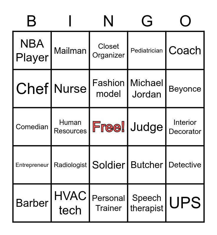 This bingo card has a free space and 24 words: Radiologist, HVAC tech, Fashion model, Barber, Coach, NBA Player, Chef, Mailman, Judge, Soldier, Michael Jordan, Comedian, Butcher, Detective, Nurse, Speech therapist, Interior Decorator, Closet Organizer, Beyonce, Human Resources, UPS, Entrepreneur, Pediatrician and Personal Trainer.