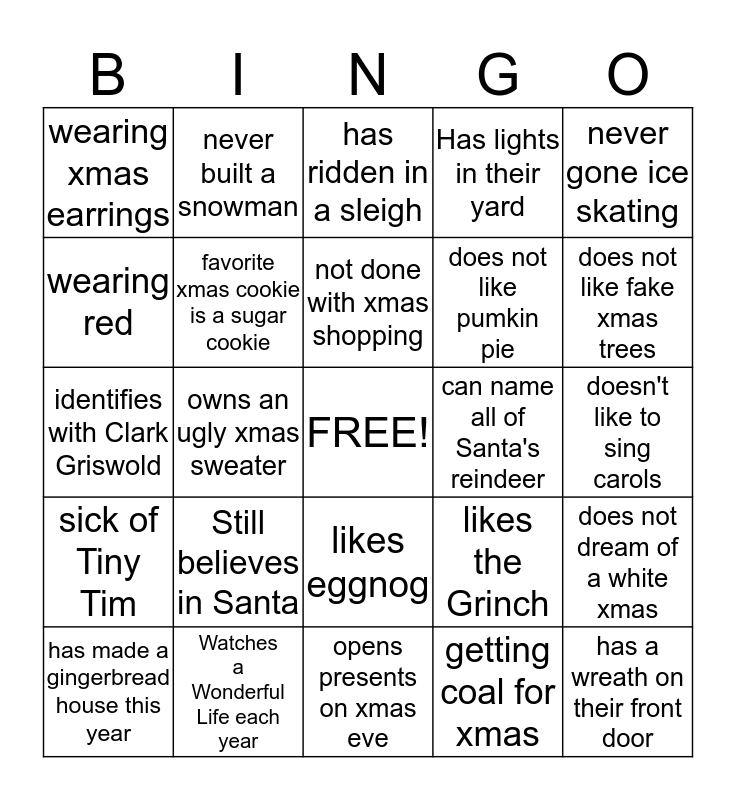 This bingo card has a free space and 24 words: Still believes in Santa, Watches a Wonderful Life each year, not done with xmas shopping, has made a gingerbread house this year, never gone ice skating, wearing xmas earrings, wearing red, never built a snowman, can name all of Santa's reindeer, likes eggnog, does not like pumkin pie, identifies with Clark Griswold, likes the Grinch, does not dream of a white xmas, favorite xmas cookie is a sugar cookie, getting coal for xmas, doesn't like to sing carols, has ridden in a sleigh, does not like fake xmas trees, owns an ugly xmas sweater, has a wreath on their front door, sick of Tiny Tim, Has lights in their yard and opens presents on xmas eve.