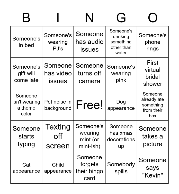 This bingo card has a free space and 29 words: Cat appearance, Someone forgot to unmute, Pet noise in background, Family member pops in to say hello, Someone's in bed, Someone has audio issues, Someone has video issues, Texting off screen, Dog appearance, Child appearance, Someone already ate something from their box, Someone says "Kevin", Someone forgets their bingo card, Somebody spills, First virtual bridal shower, Someone joins 5+ mins late, Someone's wearing mint (or mint-ish), Someone starts typing, Someone's phone rings, Someone isn't wearing a theme color, Someone has xmas decorations up, Ordered gift from registry, Someone's wearing pink, Someone's gift will come late, Someone's drinking something other than water, Someone's wearing PJ's, Someone takes a picture, Someone turns off camera and Someone just woke up.