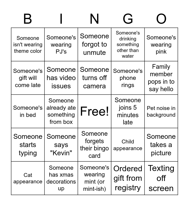 This bingo card has a free space and 29 words: Cat appearance, Someone has audio issues, Someone already ate something from box, First virtual bridal shower, Someone isn't wearing theme color, Someone forgot to unmute, Someone has video issues, Someone says "Kevin", Someone joins 5 minutes late, Someone has xmas decorations up, Pet noise in background, Texting off screen, Someone's wearing mint (or mint-ish), Ordered gift from registry, Family member pops in to say hello, Dog appearance, Someone forgets their bingo card, Someone starts typing, Someone's wearing pink, Someone's in bed, Child appearance, Somebody spills, Someone's phone rings, Someone's gift will come late, Someone's drinking something other than water, Someone's wearing PJ's, Someone takes a picture, Someone turns off camera and Someone just woke up.