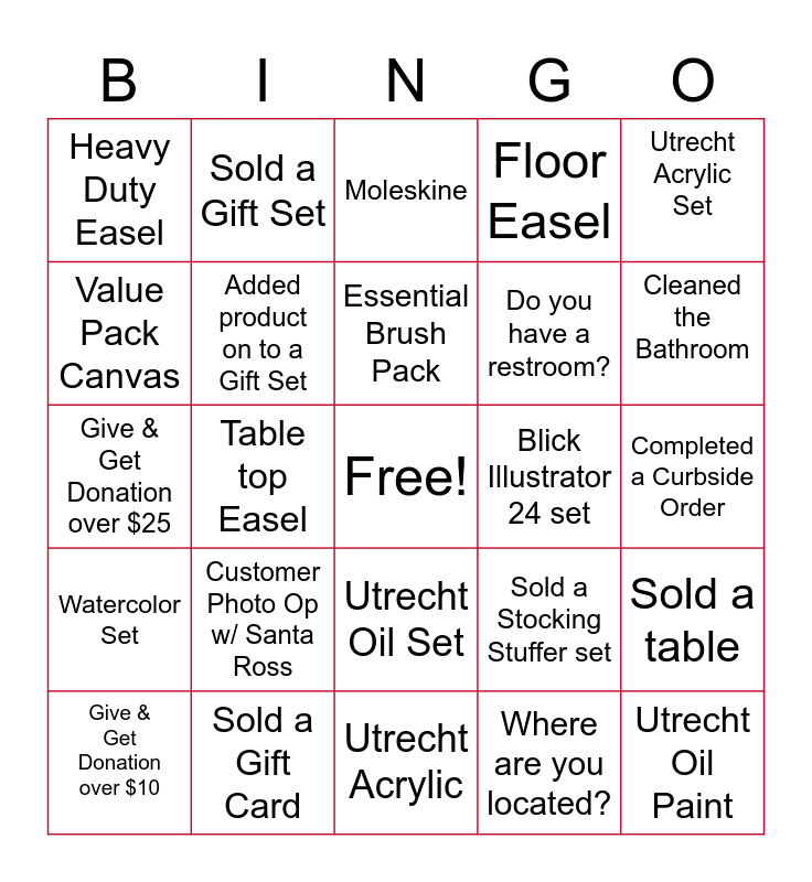This bingo card has a free space and 24 words: Customer Photo Op w/ Santa Ross, Sold a Gift Card, Essential Brush Pack, Give & Get Donation over $10, Utrecht Acrylic Set, Heavy Duty Easel, Value Pack Canvas, Sold a Gift Set, Blick Illustrator 24 set, Utrecht Oil Set, Do you have a restroom?, Give & Get Donation over $25, Sold a Stocking Stuffer set, Sold a table, Added product on to a Gift Set, Where are you located?, Completed a Curbside Order, Moleskine, Cleaned the Bathroom, Table top Easel, Utrecht Oil Paint, Watercolor Set, Floor Easel and Utrecht Acrylic.