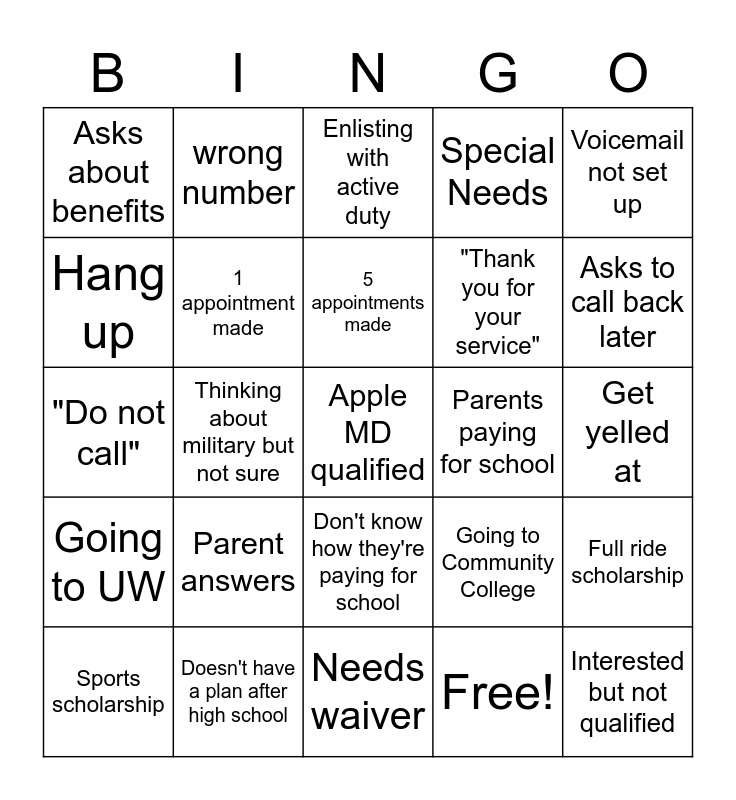 This bingo card has 30 words: Doesn't have a plan after high school, Accepted to a private university, Thinking about military but not sure, call forwarded, Asks about benefits, Enlisting with active duty, 1 appointment made, Don't know how they're paying for school, Parents paying for school, Needs waiver, Get yelled at, Apple MD qualified, Free!, Interested but not qualified, Asks to call back later, Voicemail box full, Going to Community College, Going to UW, Parent answers, Voicemail not set up, "Do not call", 3 appointments made, wrong number, "Thank you for your service", Hang up, Special Needs, Full ride scholarship, Sports scholarship, 5 appointments made and Get cursed at.