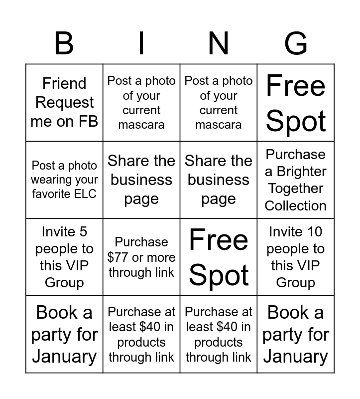 ⚠ This card has duplicate items: Post a photo wearing your favorite ELC (2), Purchase at least $40 in products through link (2), Book a party for December (2), Book a party for January (2), Purchase $77 or more through link (2), Post a photo of your current mascara (2), Like the business page (2), Friend Request me on FB (2), Invite 5 people to this VIP Group (2), Share the business page (2), Free Spot (2), Purchase a Brighter Together Collection (2), Create a LimeLife Account and share your link (2), Post a favorite photo you took this week (2), Invite 10 people to this VIP Group (2), Purchase a Take Two Collection (2)