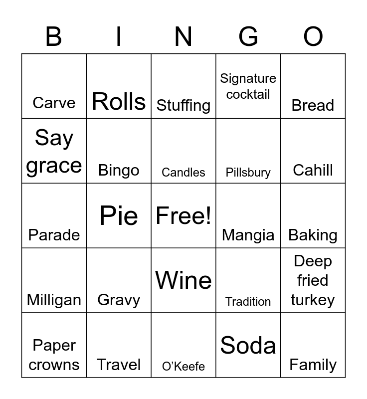 This bingo card has a free space and 84 words: Turkey, Casserole, Stuffing, Cornbread, Pecan pie, Apple pie, Mixed nuts, Cranberry, Cranberry 3 ways, Corn, Pilgrim, Leftovers, Bingo, Mangia, Ten-dah, Carve, Paper crowns, Say grace, Kiddie table, Black friday, Plates, Pillsbury, Family, Laughter, Pie, Dinner rolls, Fun, Gather, Fall, Cornucopia, Gravy, Gobble, Harvest, Parade, Pergola, House, O’Keefe, DePablo, Cahill, Milligan, Hogan, Holiday, Mashed potato, Sweet potato, November, Hand soap, Rolls, Centerpiece, Thursday, Feast, 2020, Tradition, Signature cocktail, Photos, Candy corn, Chocolate turkey, Travel, Candles, Apron, Baking, Cooking, Napkin, Pumpkin pie, Apple cider, Stuffed mushroom, Clam dip, Crackers, Brie Bites, Bread, Antipasto, Deep fried turkey, Williams-Sonoma, Marshmallow, Dessert, Wine, Soda, Beer, Seltzer, Football, Tablecloth, Placesetting, Serving spoon, Happy pilgrim and Fall leaves.