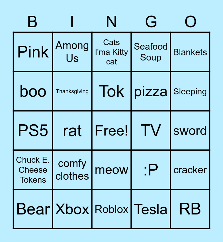 This bingo card has a free space and 34 words: Toys, Tesla, Burrito, French Fries, Chuck E. Cheese Tokens, Thanksgiving, Blankets, Bear, Among Us, Tik, Tok, Cats I'ma Kitty cat, Hiking, Pug, TV, Sleeping, Xbox, PS5, comfy clothes, :P, meow, Chocolate, Pink, sword, Roblox, RB, Seafood Soup, Taco bell, pizza, boo, music, rat, cracker and poke.